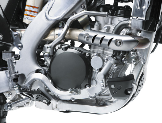 ブリッジドボックスボトムピストンを装備(量産車初採用は2010年KX250F/450F)。短いスカート、強化されたピストンピン周辺のリブに加え、スカート内側に設けられたブリッジによるボックス形状を特徴とし、さらなる軽量化と高剛性化を達成。ファクトリースペックのピストンにより、超高回転域でのエンジン性能を向上させている。