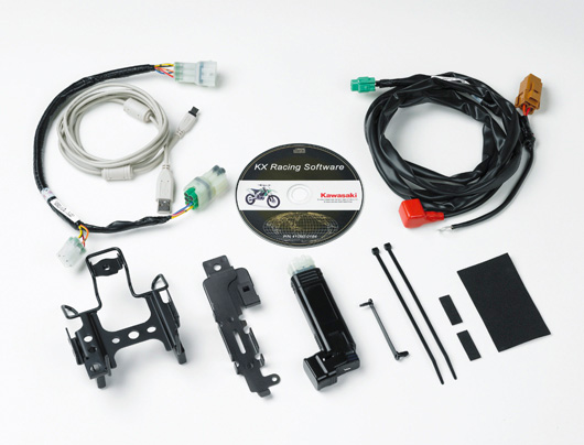 過酷で激しいモトクロスレースに対応する、軽量、コンパクトなECU。アクセスしやすい、フロントナンバープレート裏に配置している。オプションのKX FI キャリブレーションキットを使用することにより、セッティングの書き換えが可能。